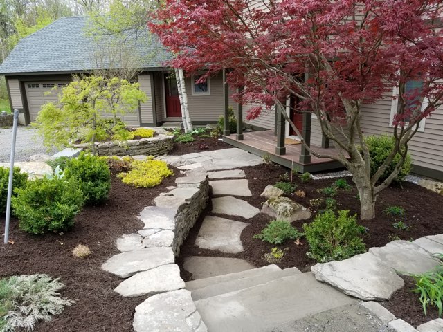 Over the years Tomich Landscape Design has transformed our property from a yard with a few scrawny shrubs into a relaxing oasis of flowering perennials and ornamental trees accented by a series of distinctive stones that each have a personality of their own. The overall effect is seamless, but each element stands out too. Friends never cease to marvel over the front walkway showcasing huge panels of Goshen stone, while the sweep of the gravel patio in the back has created a lovely setting to entertain in the summer as well as drawing one’s gaze during the chilly months of winter. An innovative rock pool with a bubbling fountain has provided us with endless entertainment by attracting a variety of beautiful birds who appreciate a refreshing splash. Our collaboration has been both creative and rewarding. Following a brainstorming session or two, their brilliant designer develops a holistic plan that weaves everything together into a result more amazing than we ever imagined. Tomich’s intuitive grasp of what will best suit the contours of the land, an encyclopedic knowledge of trees and plants and a sure understanding of what will thrive in sun or shade all combine to make the plan come to life—and stay that way! Our experience in the Berkshires has been deeply enriched by our relationship with Tomich Landscape Design and their friendly and expert crew. We’re already thinking about our next project!